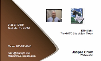 directory, just Click HERE ETinSight Business Card Directory is a localized directory featuring businesses, merchant services, restaurants, retailers, real estate agents, manufactures, government links, and more in Camp, Franklin, Morris, Titus & surrounding Counties. You can also include an email link, link to your business website, or offer your customers more information and driving directions to your front door... (Annual Fee Required) Find out more here. |